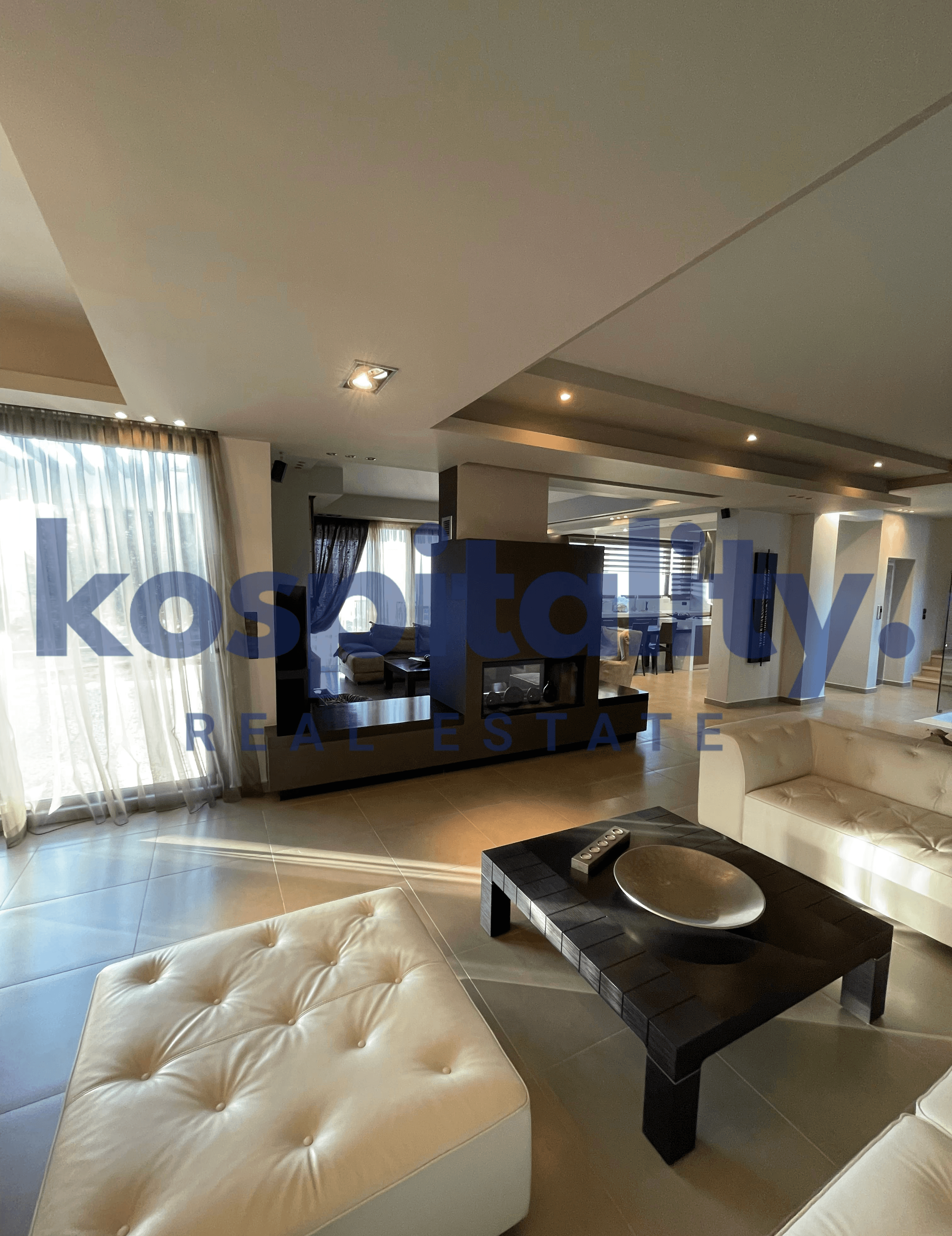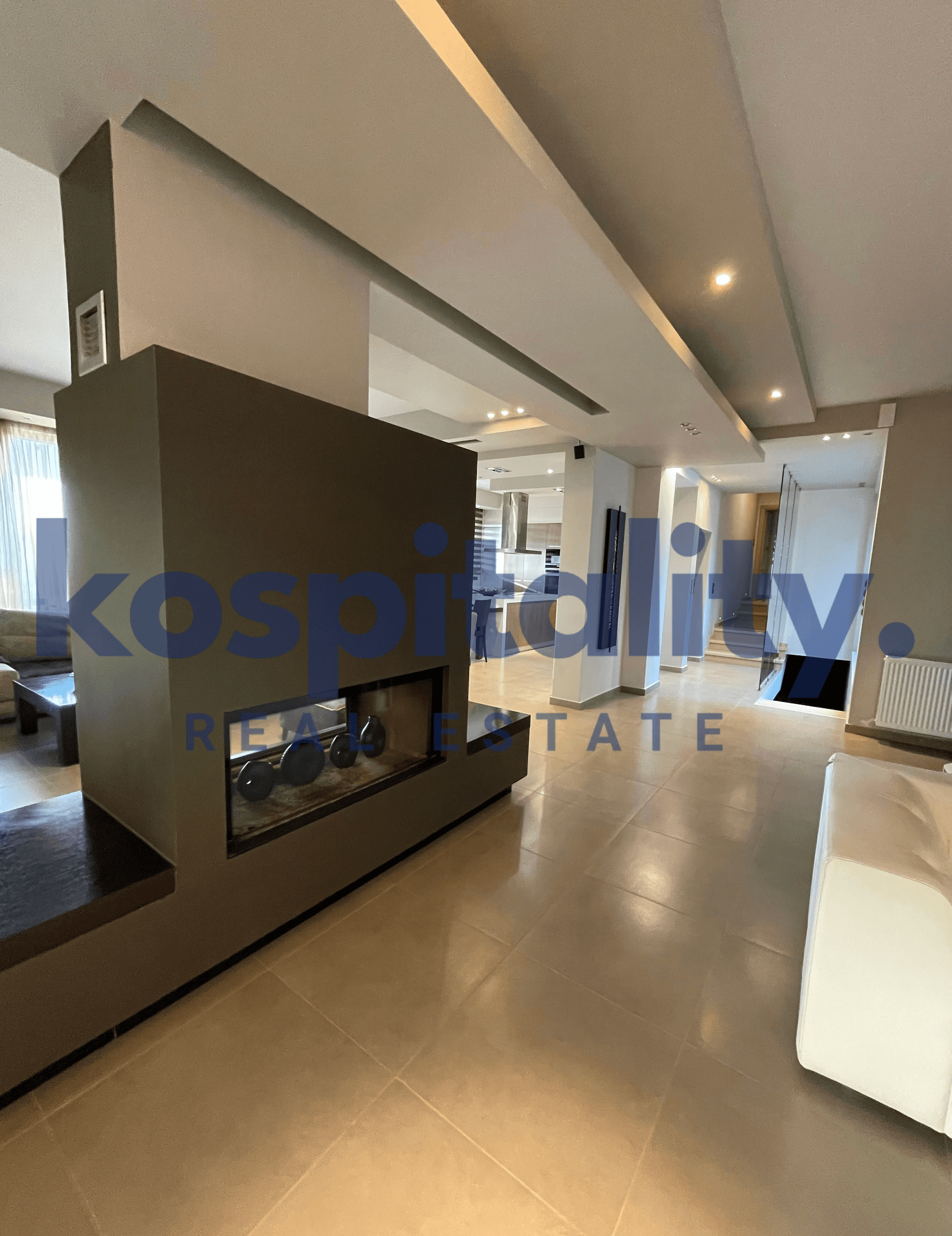 Includes the kitchen with pantry, sitting and dining areas, living room with a double-sided fireplace, and a guest WC.